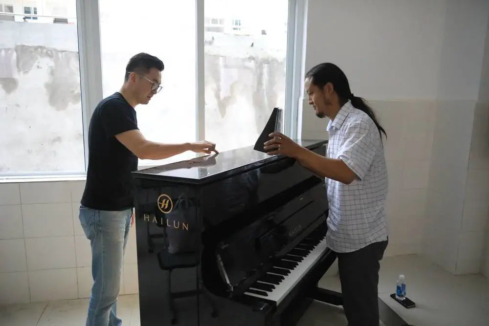 在這里需要感謝海倫鋼琴的工作人員及時將鋼琴安裝到校園的音樂教室,由于當地交通條件較差,工作人員用了近一天時間才將鋼琴安裝調試完成,辛苦你們了
