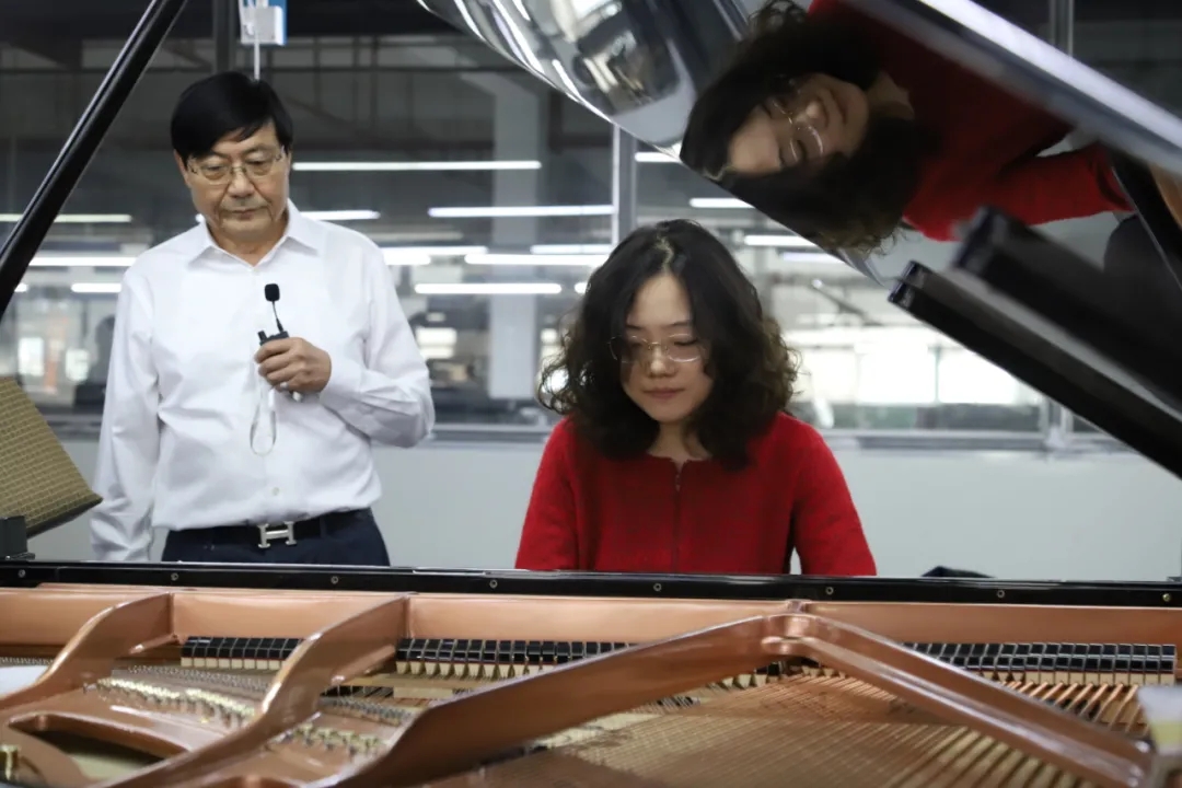 ▲寧波大學(xué)來訪教師在車間試奏立式鋼琴